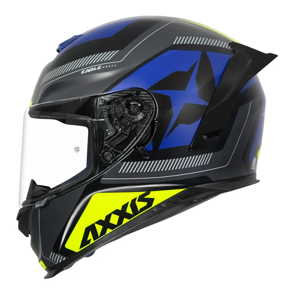 Introducing the Axxis Eagle full-face helmet with excellent levels of safety. The helmet has triple certifications, ECE 22.05, DOT and ISI. The helmet has a polycarbonate shell, internal ventilation, dual visor and an aerodynamically designed spoiler that makes it perfect for every rider