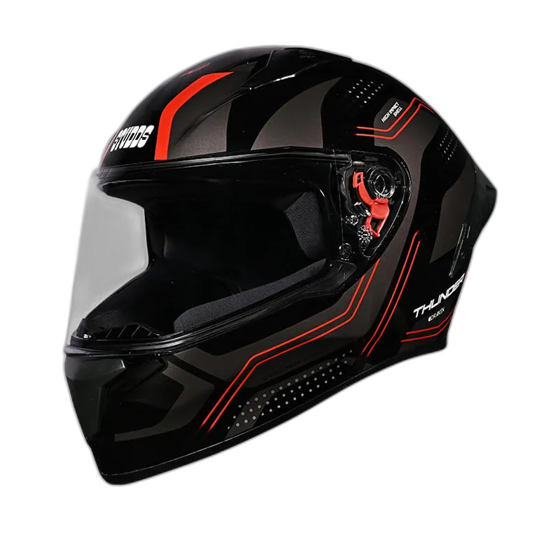 Thunder is one of the most stylish and aggressive helmets from STUDDS. Its aerodynamic design complimented with spoiler and attractive solid colour gives it a perfect look. Thunder is a full face helmet with aerodynamic design , dynamic ventilation system, quick release visor and chin strap.